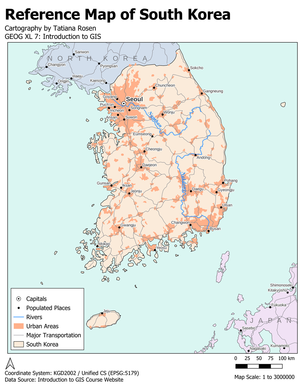 Created using QGIS, notes country borders, neighboring countries, major rivers, major transportation, urban areas, cities and the capital.
